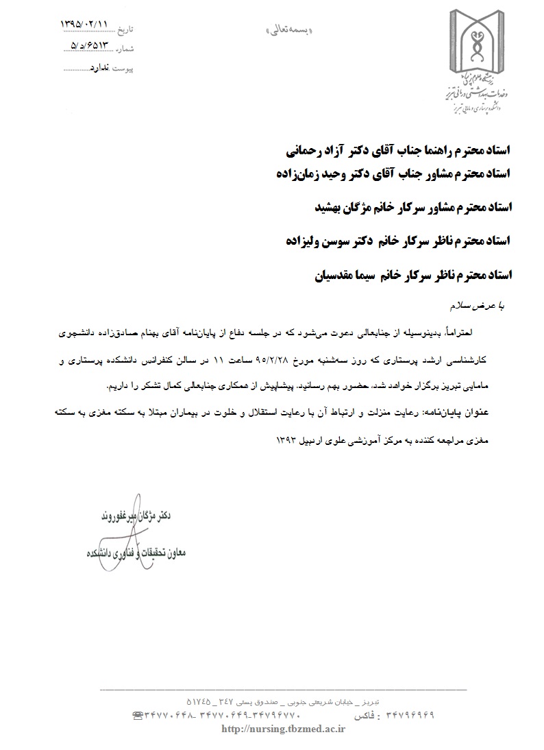 جلسه دفاع از پایاننامه آقای بهنام صادق زاده، دانشجوی کارشناسی ارشد پرستاری