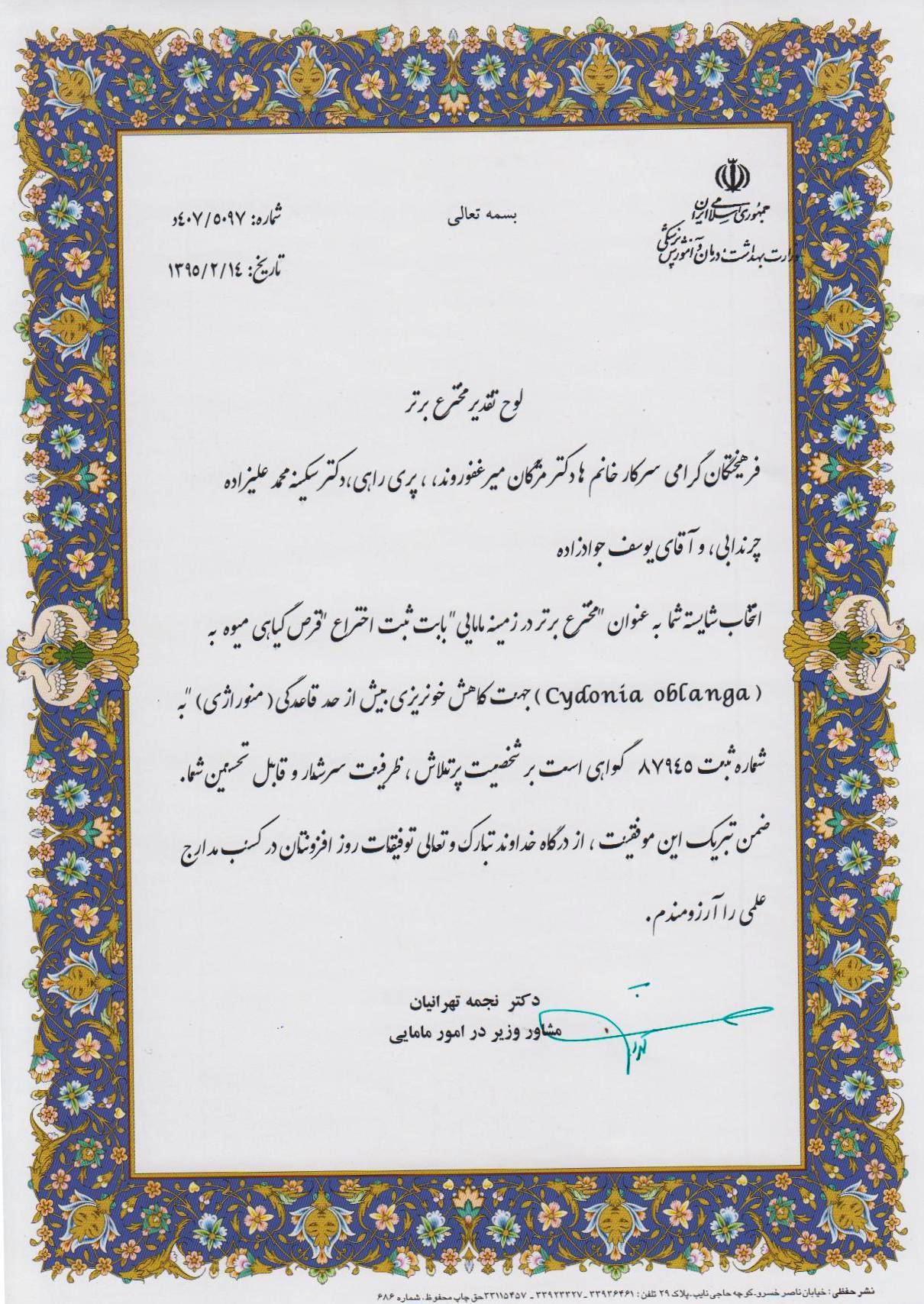 دریافت لوح تقدیر مخترع برتر در زمینه مامایی