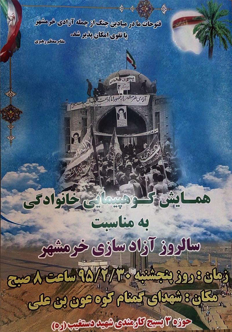 بمناسبت گرامیداشت سالروز آزادسازی خرمشهر و تجدید میثاق با آرمانهای شهدای هشت سال دفاع مقدس، مراسم کوهپیمایی روز پنجشنبه مورخه 30 اردیبهشت انجام خواهد گرفت