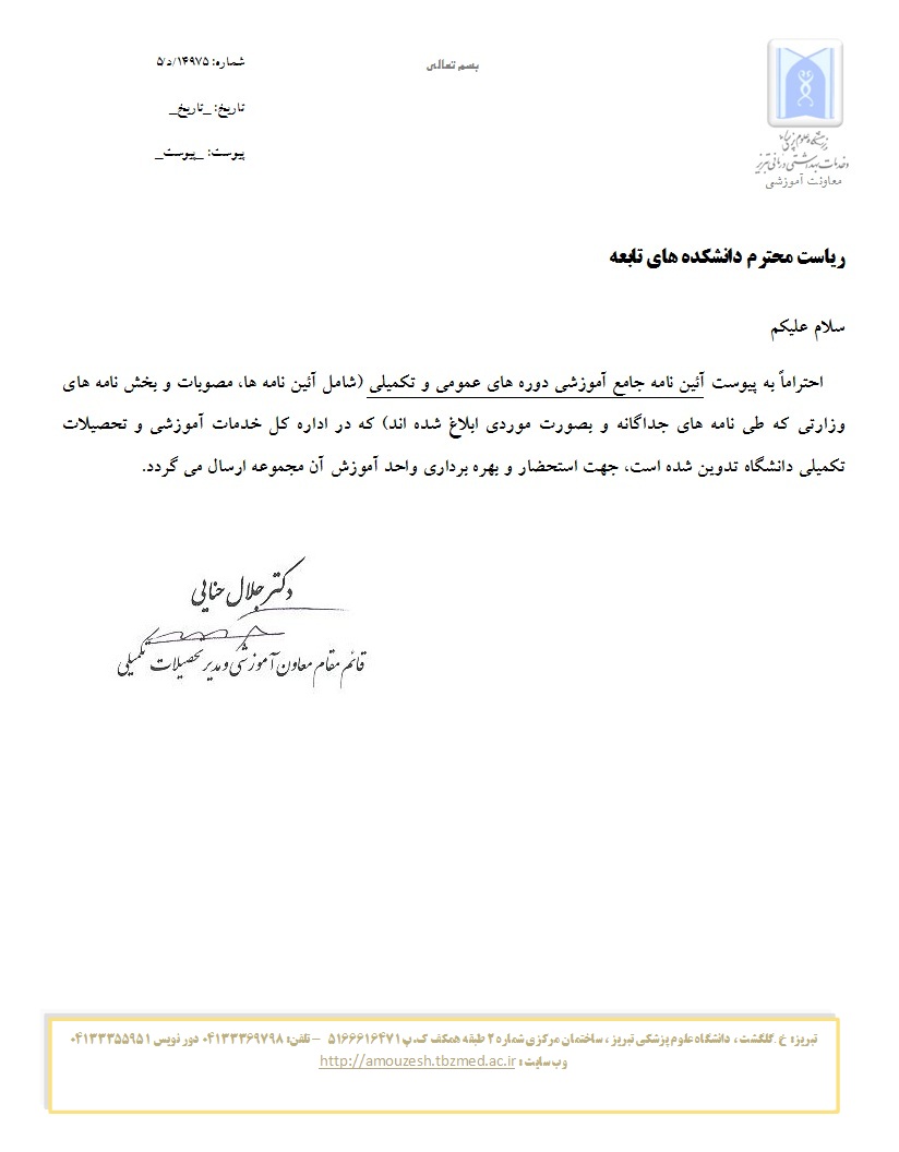 جناب آقای دکتر جلال حنایی، قائم مقام معاون آموزشی و تحصیلات تکمیلی دانشگاه با ارسال نامه ای، آئین نامه جامع آموزشی دوره های عمومی و تکمیلی را ارسال نمودند.