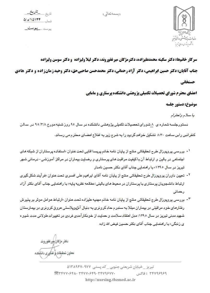 دستور جلسه هشتمین شورای تحصیلات تکمیلی پژوهشی دانشکده در سال 95؛ روز شنبه مورخه 8 خرداد