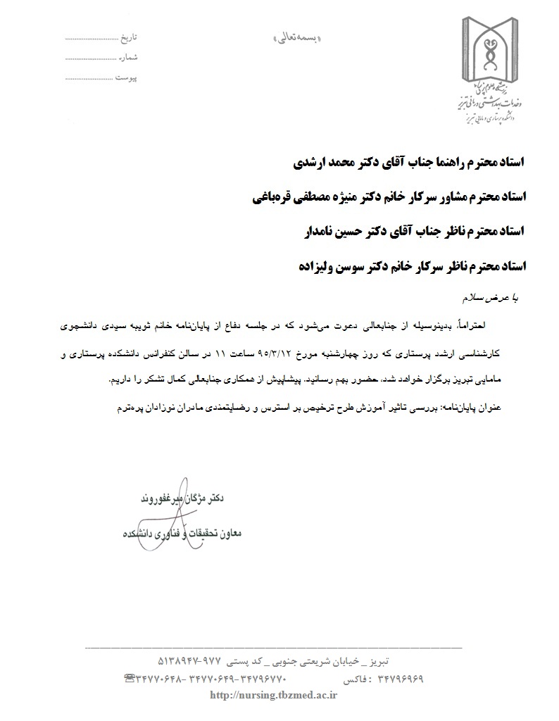 جلسه دفاع از پایاننامه خانم ثویبه سیدی، دانشجوی کارشناسی ارشد پرستاری