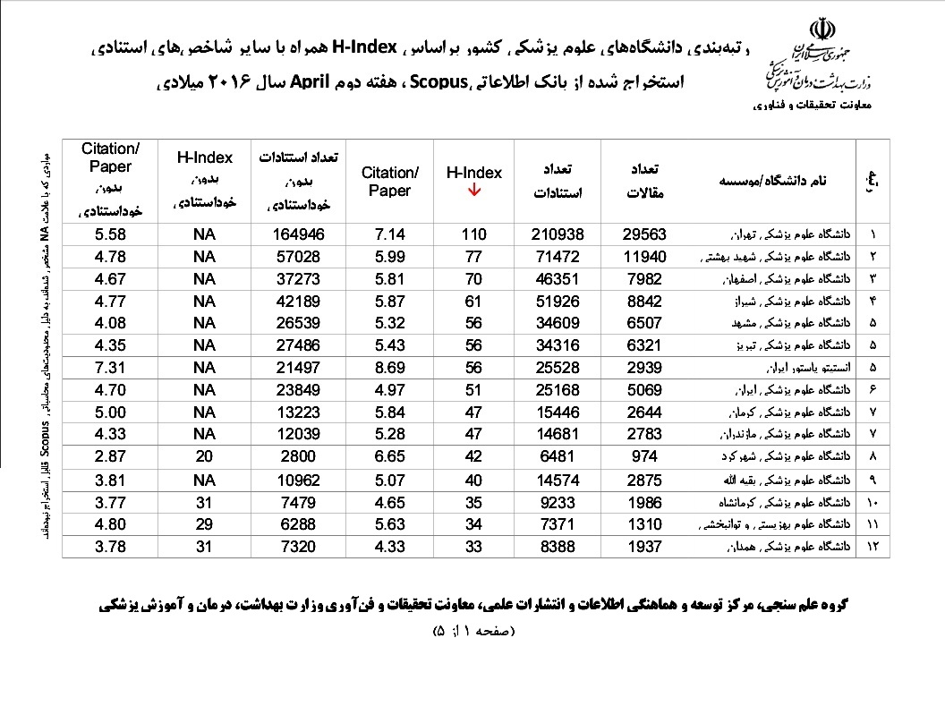 لازم به ذکر است که تعداد دانشگاهها و موسسات آموزشی مورد بررسی از 43 مورد در گزارش قبلی مربوط به هفته دوم اکتبر 2015 به تعداد 65 دانشگاه در هفته دوم آپریل 2016 افزایش یافته است. بر اساس نتایج این بررسی، دانشگاه های علوم پزشکی تهران، شهید بهشتی، اصفهان و شیراز از نظر شاخص H-Index به ترتیب در رتبه های اول تا چهارم قرار گرفتند. این گزارش هر شش ماه یک بار روزآمد و منتشر میشود.