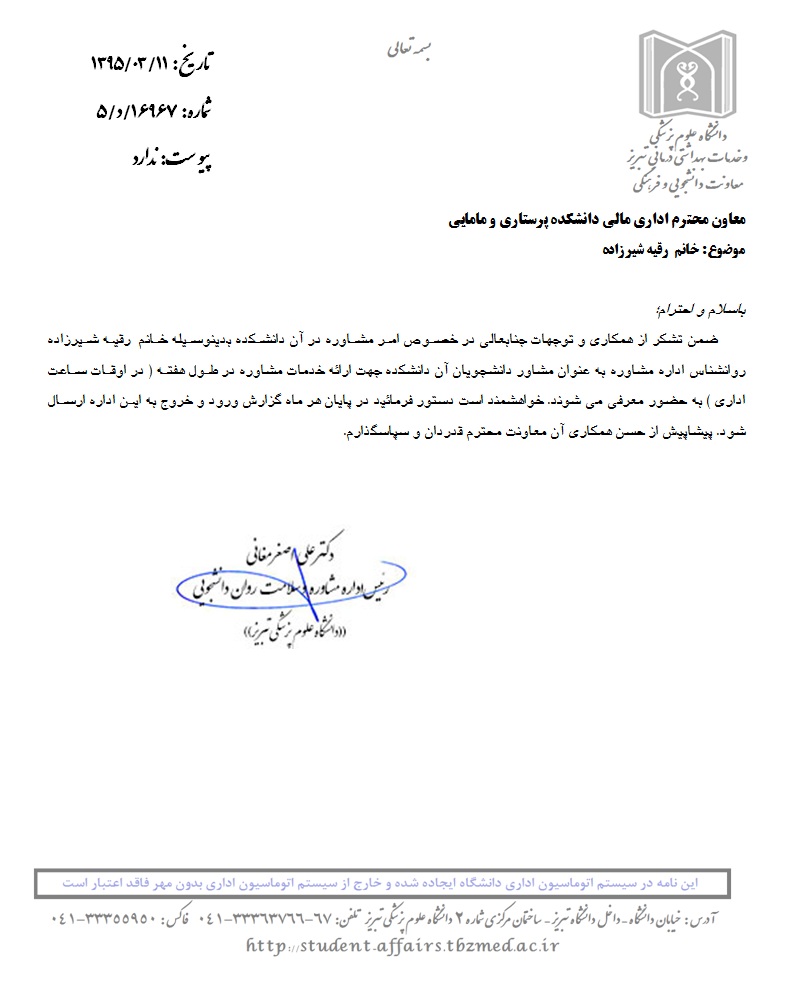 بنا بر اعلام دکتر علی اصغر مغانی، رئیس اداره مشاوره و سلامت روان دانشجویی، سرکار خانم رقیه شیرزاده بعنوان مشاور دانشجویان دانشکده جهت ارائه خدمات مشاوره معرفی گردیدند.