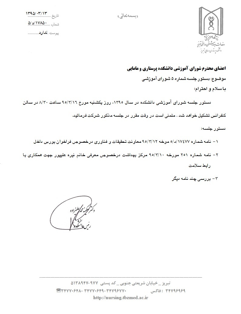 دستور جلسه پنجمین جلسه شورای آموزشی دانشکده در سال 95؛ روز شنبه مورخه 16 خرداد