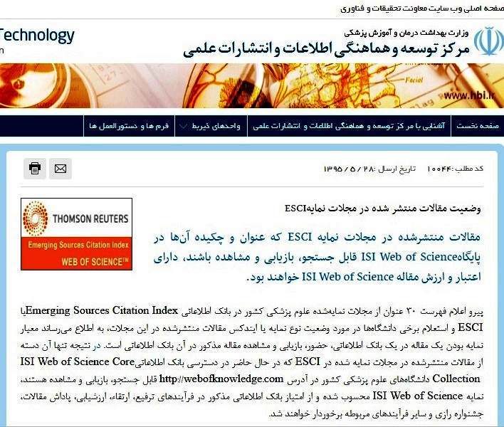 پیرو اعلام فهرست 30 عنوان از مجلات نمایهشده علوم پزشکی کشور در بانک اطلاعاتی Emerging Sources Citation Index یا ESCI و استعلام برخی دانشگاهها در مورد وضعیت نوع نمایه یا ایندکس مقالات منتشرشده در این مجلات، به اطلاع میرساند معیار نمایه بودن یک مقاله در یک بانک اطلاعاتی، حضور، بازیابی و مشاهده مقاله مذکور در آن بانک اطلاعاتی است. در نتیجه تنها آن دسته از مقالات منتشرشده در مجلات نمایه شده در ESCI که در حال حاضر در دسترسی بانک اطلاعاتیISI Web of Science Core Collection دانشگاههای علوم پزشکی کشور در آدرس http://webofknowledge.com قابل جستجو، بازیابی و مشاهده هستند، نمایه ISI Web of Science محسوب شده و از امتیاز بانک اطلاعاتی مذکور در فرآیندهای ترفیع، ارتقاء، ارزشیابی، پاداش مقالات، جشنواره رازی و سایر فرآیندهای مربوطه برخوردار خواهند شد.