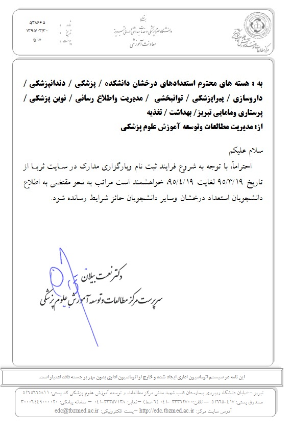 با توجه به شروع فرآیند ثبت نام و بارگزاری مدارک در سایت ثریا از تاریخ 9 خرداد لغایت 19 تیر، مراتب جهت اطلاع دانشجویان استعداد درخشان و سایر دانشجویان حائز شرایط جهت ثبت نام در سایت اعلام میگردد.