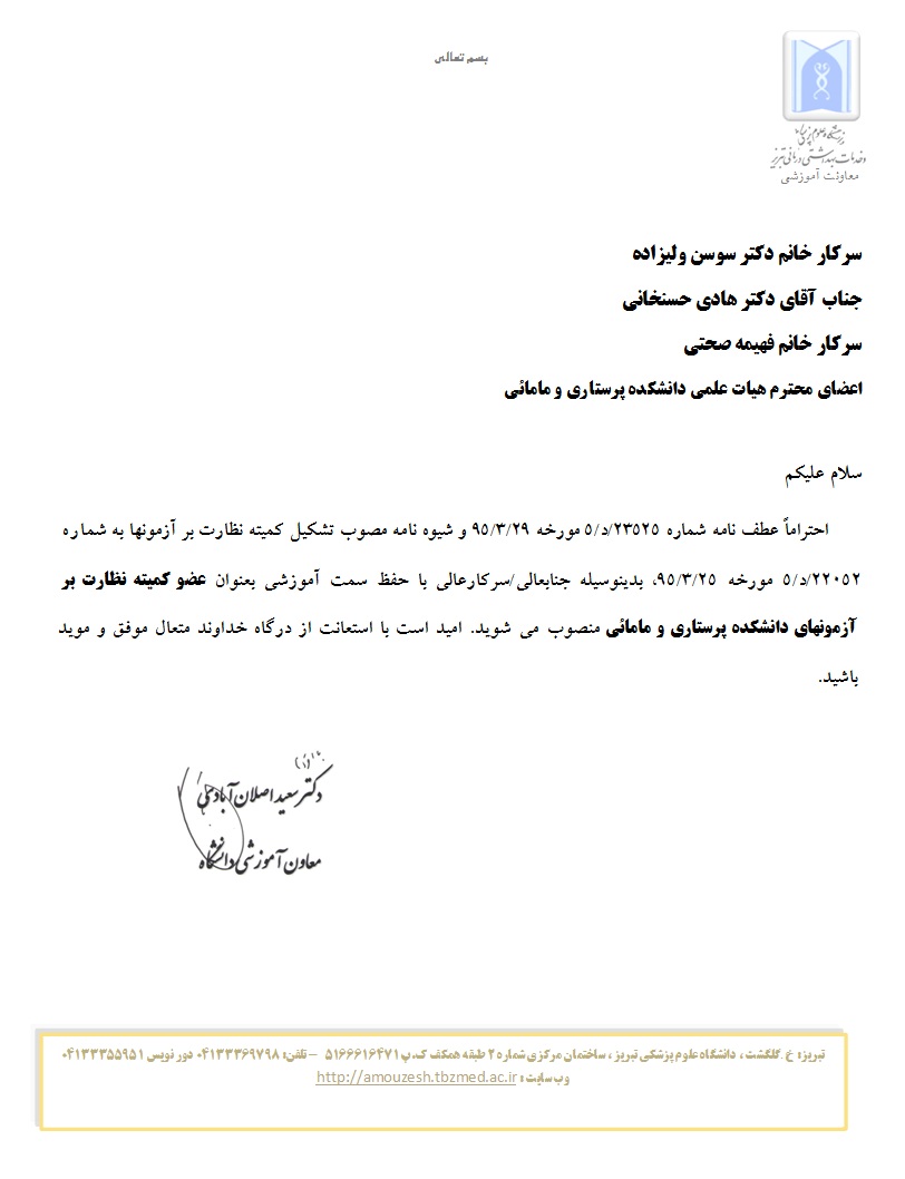 سرکار خانم ها دکتر سوسن ولیزاده و فهمیه صحتی و جناب آقای دکتر هادی حسنخانی از سوی معاون آموزشی دانشگاه، بعنوان اعضای کمیته نظارت بر آزمونهای دانشکده منصوب شدند.