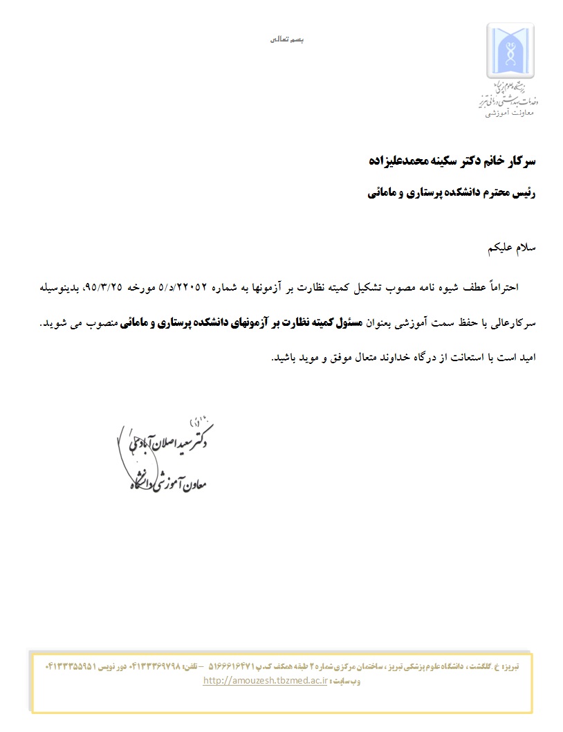 ریاست محترم دانشکده سرکار خانم دکتر سکینه محمدعلیزاده از سوی معاون آموزشی دانشگاه، بعنوان مسئول کمیته نظارت بر آزمونهای دانشکده منصوب شد.