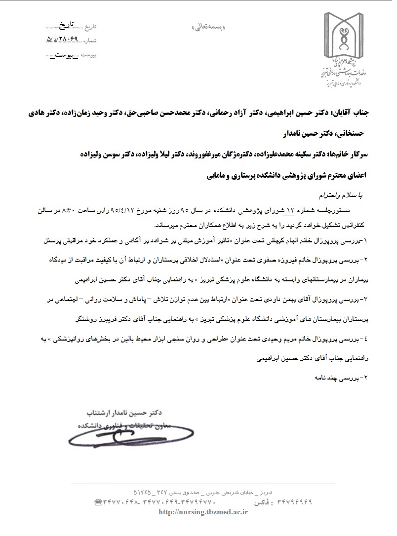 دستور جلسه دوازدهیمن شورای تحصیلات تکمیلی پژوهشی دانشکده در سال 95؛ روز شنبه مورخه 12 تیر