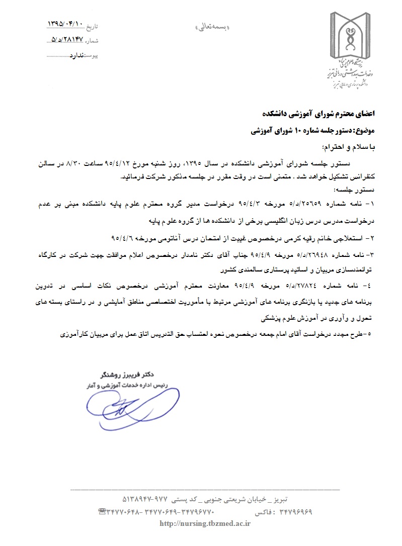 دستور جلسه دهمین جلسه شورای آموزشی دانشکده در سال 95؛ روز شنبه مورخه 12 تیر