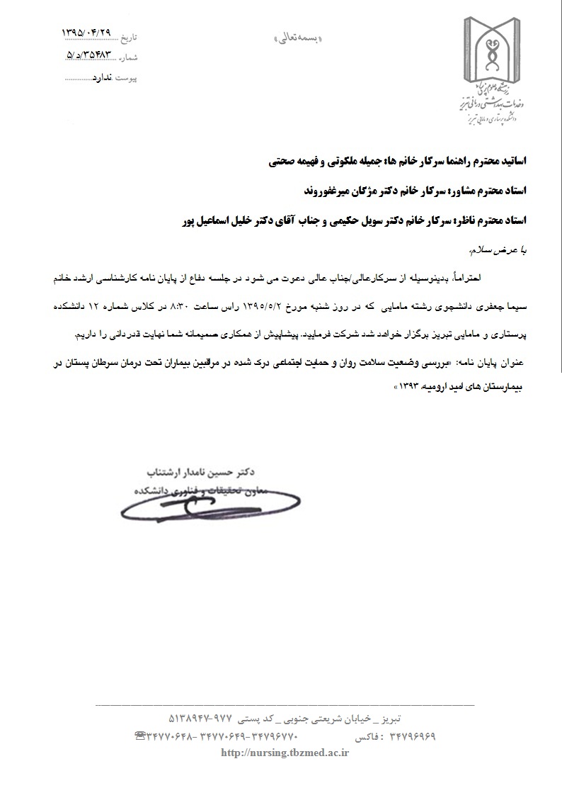جلسه دفاع از پایاننامه خانم سیما جعفری، دانشجوی کارشناسی ارشد مامایی