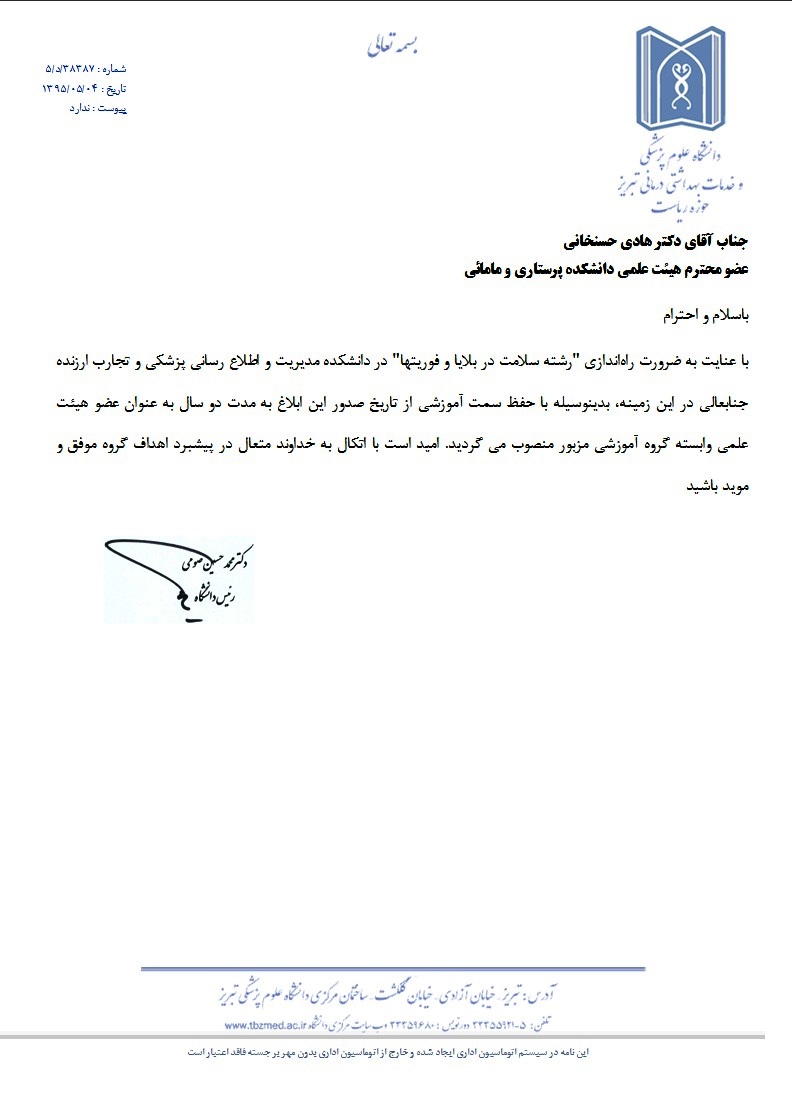 با عنایت به ضرورت راه اندازی رشته "سلامت در بلایا و فوریت ها" در دانشکده مدیریت و اطلاع رسانی پزشکی و تجارب ارزنده جنابعالی در این زمینه، بدینوسیله با حفظ سمت آموزشی از تاریخ ...