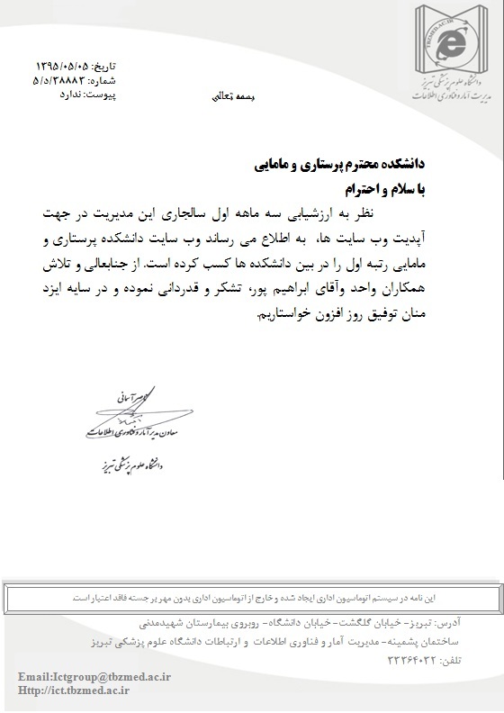 نظر به ارزشیابی سه ماهه اول سالجاری این مدیریت آمار و فناوری اطلاعات دانشگاه در جهت آپدیت وبسایت ها، به اطلاع می رساند وبسایت دانشکده پرستاری و مامایی تبریز موفق به کسب مقاوم اوّل در بین وبسایتهای دانشگاه گردیده ...