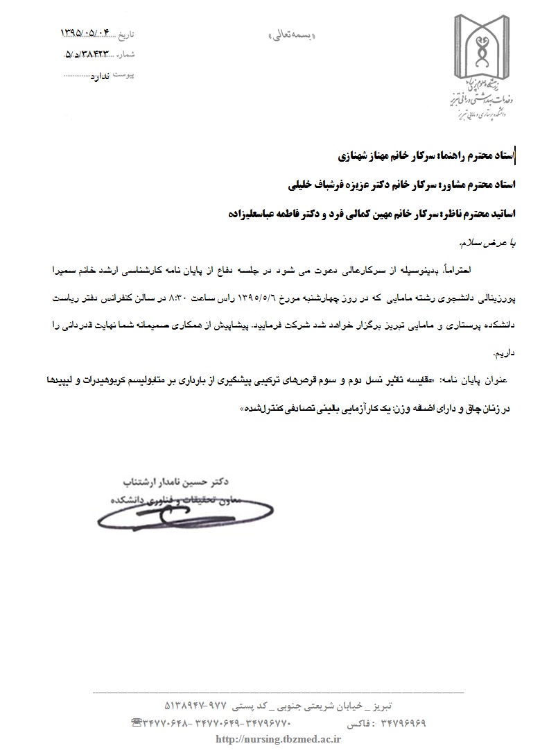 جلسه دفاع از پایاننامه خانم سمیرا پور زینالی، دانشجوی کارشناسی ارشد مامایی
