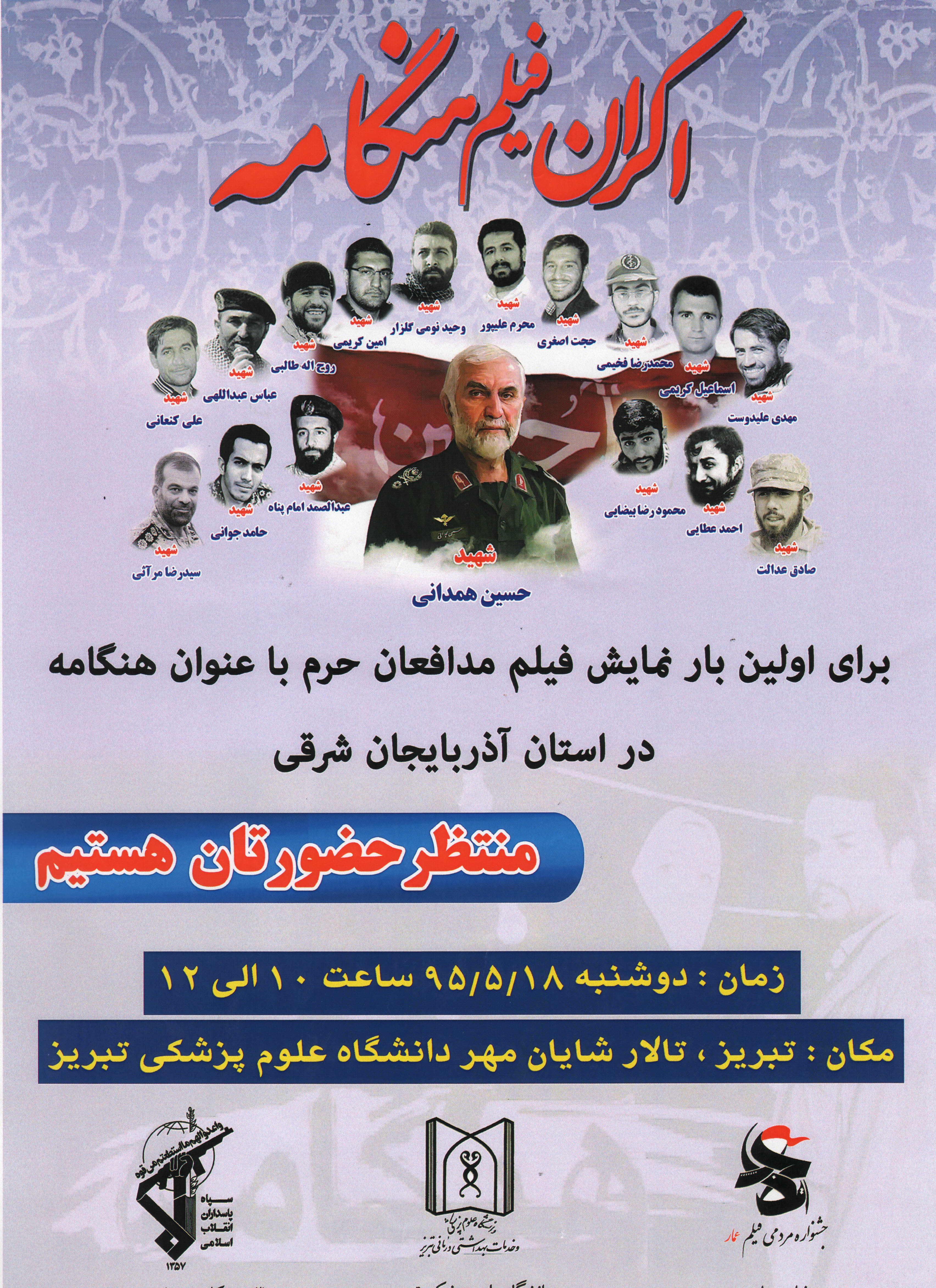 برای اولین بار نمایش فیلم مدافعان حرم، با عنوان "هنگامه" در استان آذربایجان شرقی روز دوشنبه مورخه 18 مرداد از ساعت 10 الی 12 در تالار شایانمهر دانشگاه علوم پزشکی ...