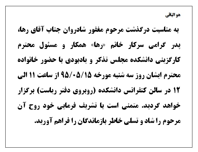 به مناسبت درگذشت مرحوم مغفور شادروان جناب آقای رها، ابوی گرامی سرکار خانم «رها» همکار و مسئول محترم کارگزینی دانشکده مجلس تذکر و یادبودی با حضور خانواده محترم ایشان روز سه شنبه مورخه ...