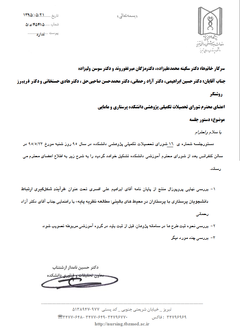 دستور جلسه شانزدهمین شورای تحصیلات تکمیلی پژوهشی دانشکده در سال 95؛ روز شنبه مورخه 23 مرداد