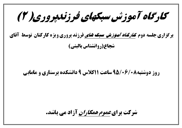 کارگاه آموزش سبک های فرزندپروری (2) روز دوشنبه مورخه هشتم شهریور ماه از ساعت 11 الی 12:30 در کلاس شماره 9 دانشکده برگزار خواهد گردید. شرکت برای عموم علاقمندان آزاد است.
