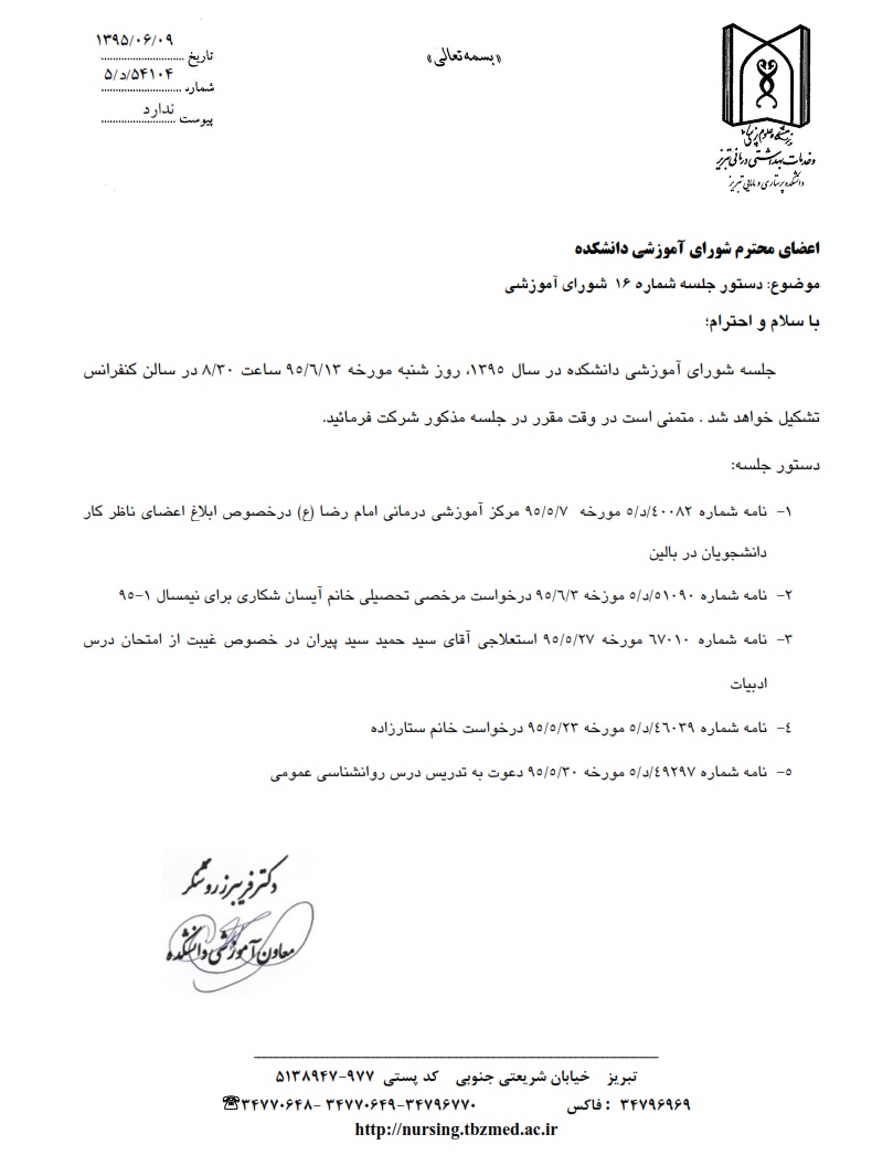 دستور جلسه شانزدهمین جلسه شورای آموزشی دانشکده در سال 95؛ روز شنبه مورخه 13 شهریور