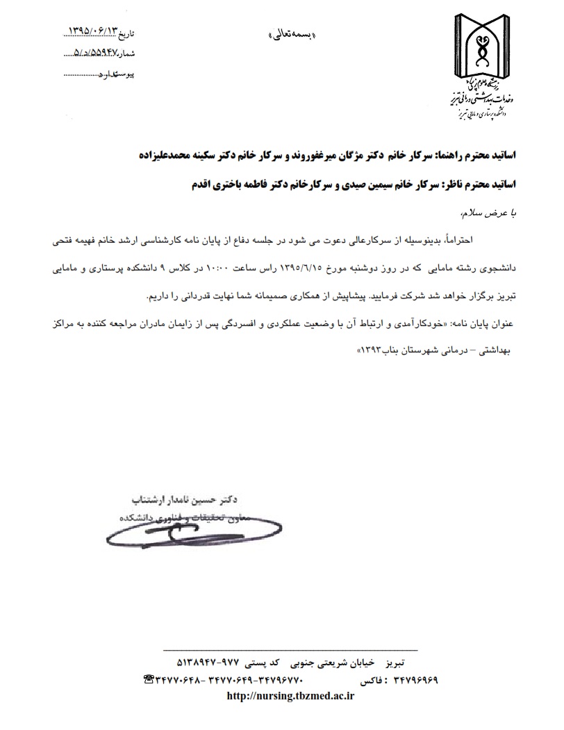جلسه دفاع از پایاننامه خانم فهیمه فتحی، دانشجوی کارشناسی ارشد مامایی