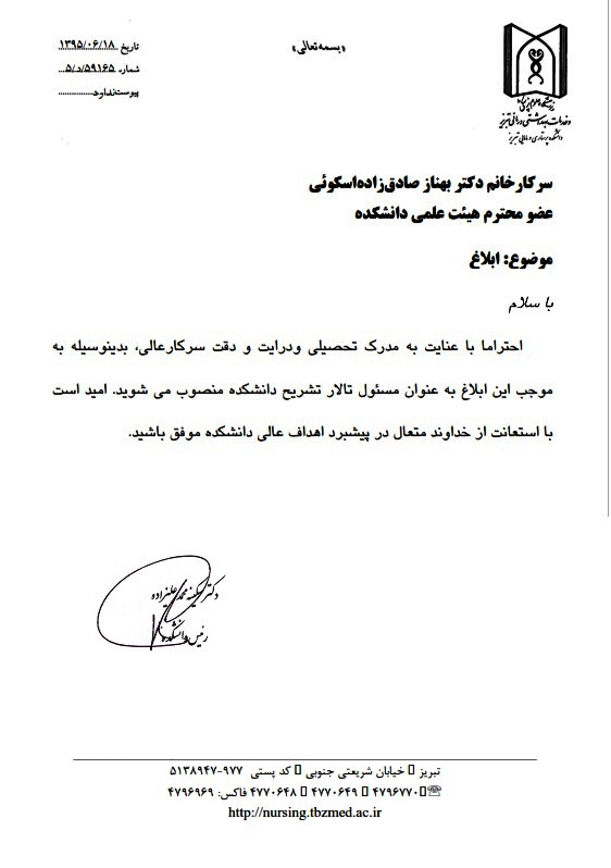 ریاست دانشکده طی ابلاغ حکمی، سرکار خانم دکتر بهناز صادق زاده عضو هیات علمی گروه مامایی را بعنوان مسئولیت تالار تشریح دانشکده منصوب کردند.