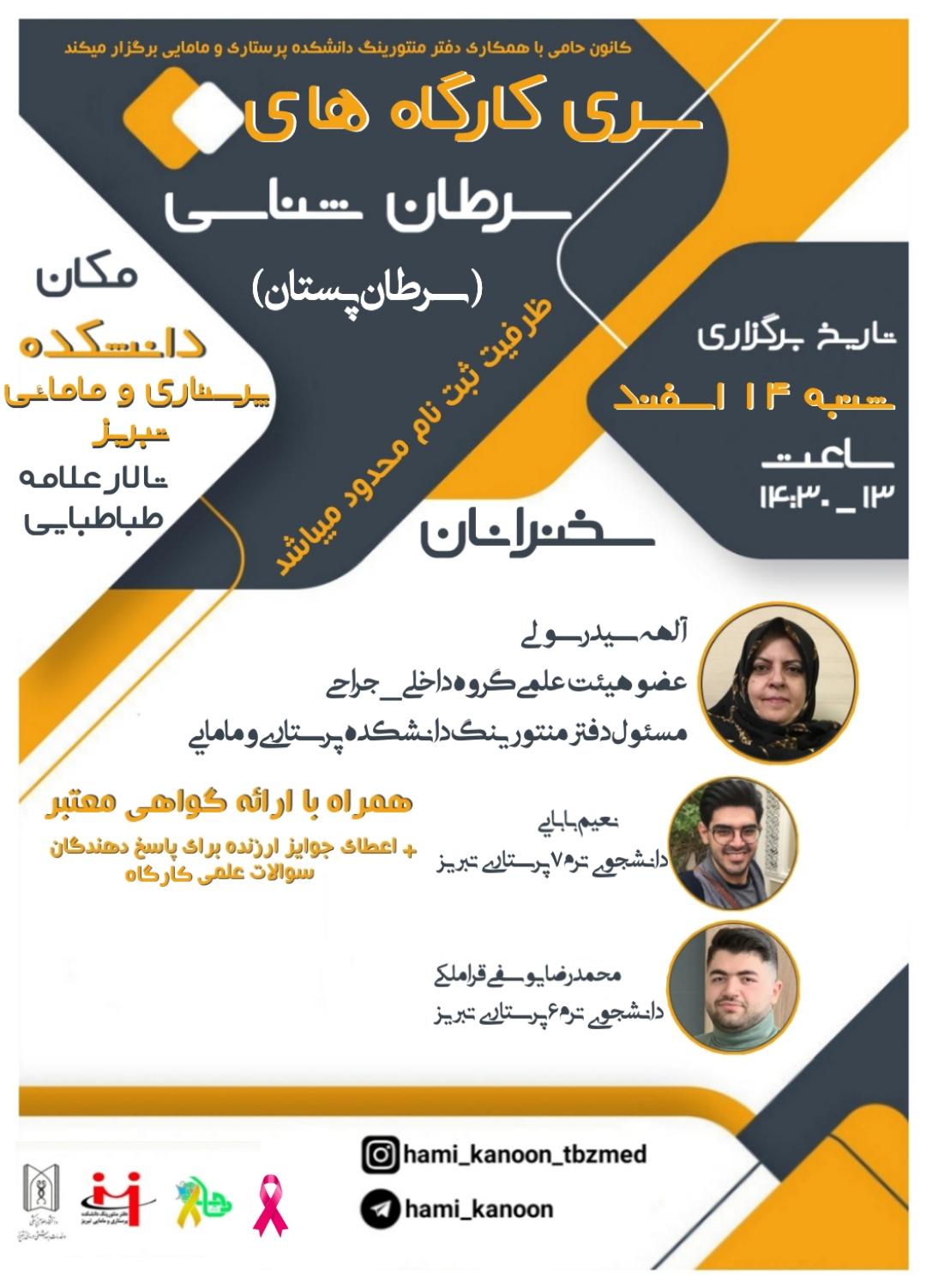 * برگزاری کارگاه "سرطان شناسی (سرطان پستان)" (شنبه 14 اسفند 1400). پوستر کارگاه / تصاویر (1 / 2 / 3 / 4 / 5)