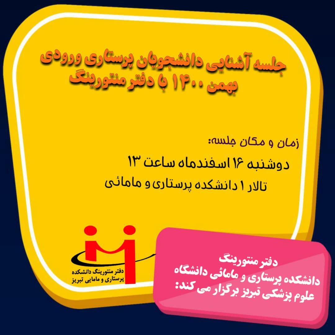 * جلسه آشنایی دانشجویان جدیدالورود بهمن ماه 1400 با فعالیت و اهداف های دفتر منتورینگ (16 اسفند 1400). پوستر برنامه / تصاویر (1 / 2 / 3 / 4 / 5 / 6 / 7 / 8 / 9)