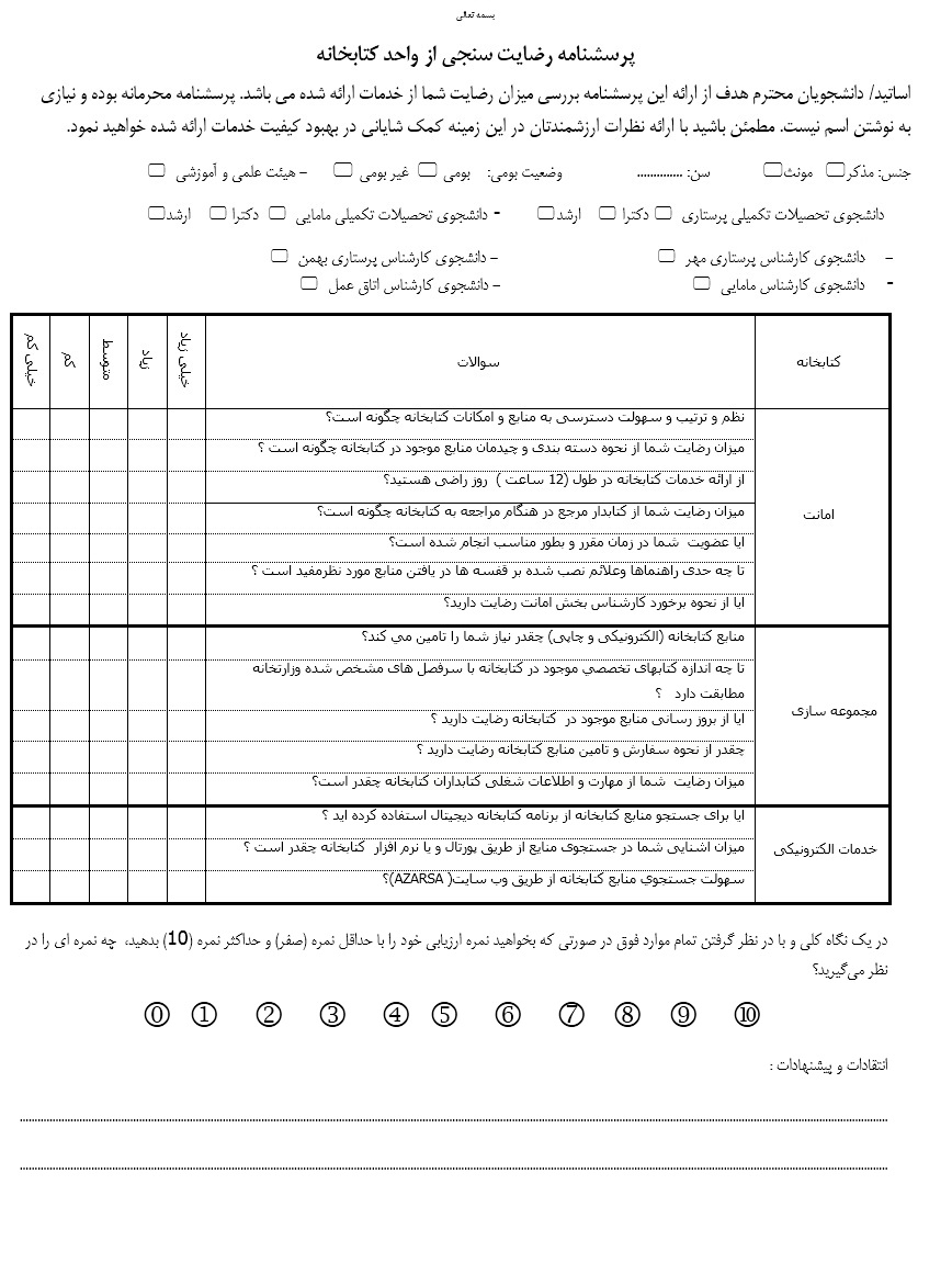 جهت دریافت فایل پرسشنامه رضایت سنجی واحد کتابخانه کلیک نمائید. (doc / pdf)